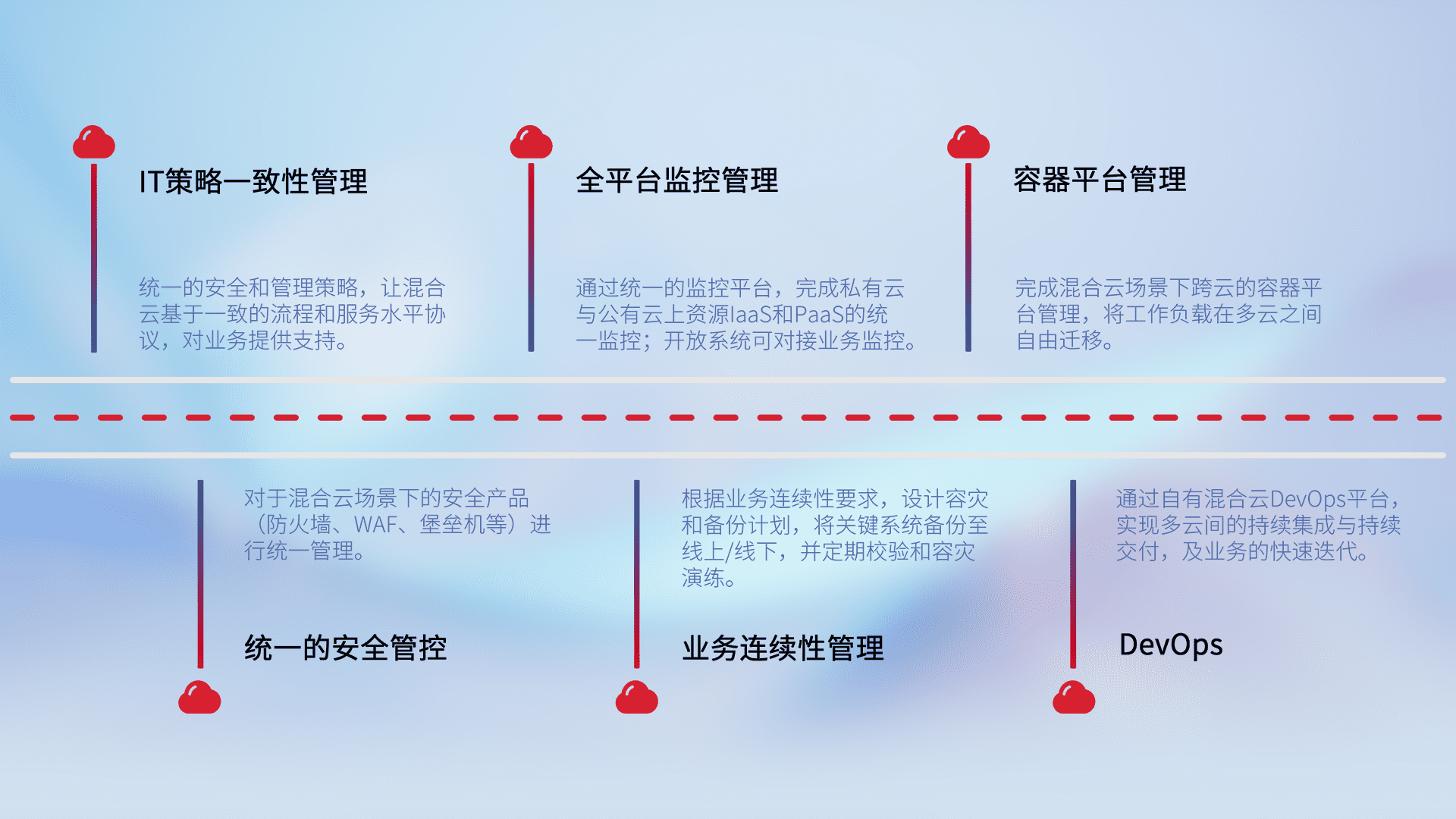 通过多云纳管,,以统一的资源数据模型把客户的云资源进行抽象和封装,,,进而实现对多云资源的统一操作,,保障云资源管理的可靠性、、、、稳定性与可用性。。量身定制化运维内容,,,,配置、、、开发运维、、、、补丁管理、、、备份、、、、监控、、认证和访问管理、、、审计和日常巡检等,,,保障在用云过程中的可靠度,,,,稳定度以及高可用率。。。。